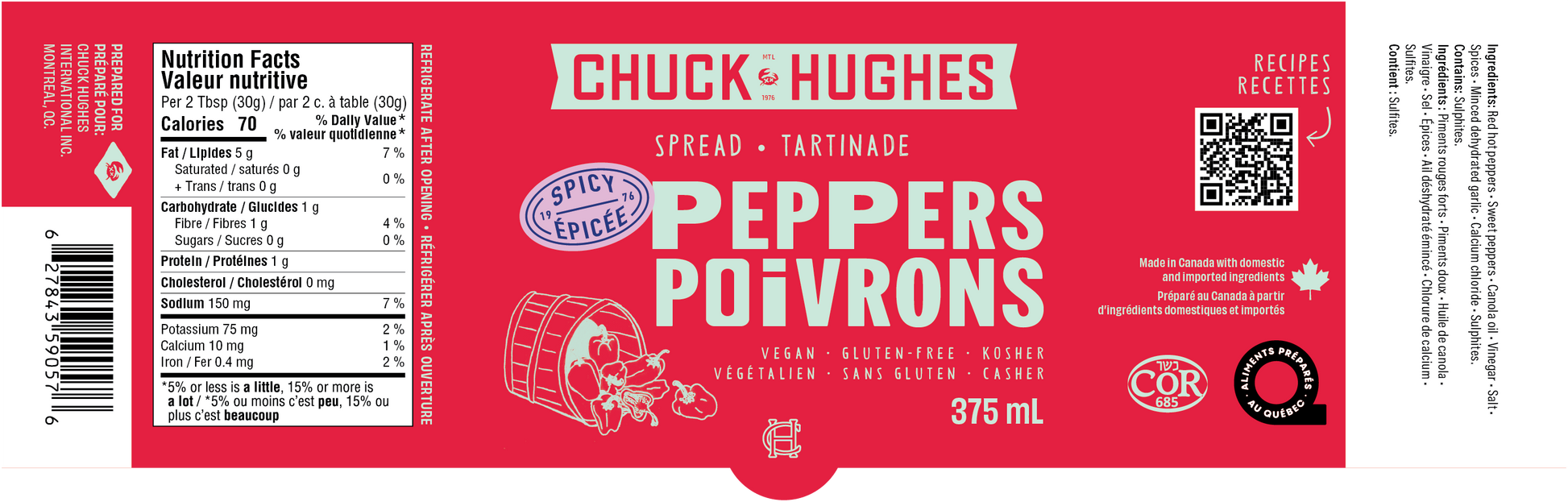 Ingrédients : Piments rouges • Piments doux • Huile de canola • Vinaigre • Sel • Épices • Ail déshydraté émincé • Chlorure de calcium • Sulfites.